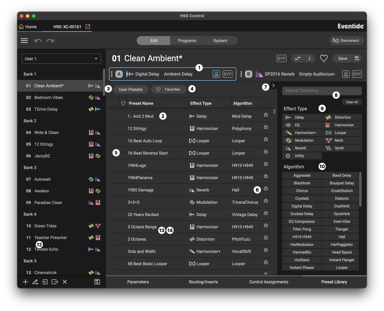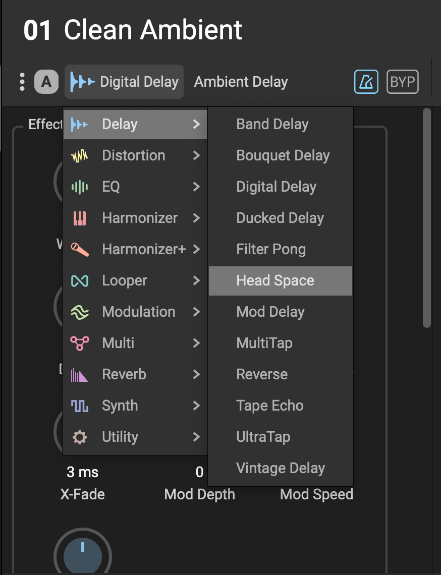 Edit Preset specific parameters, such as mix, delay time, etc.