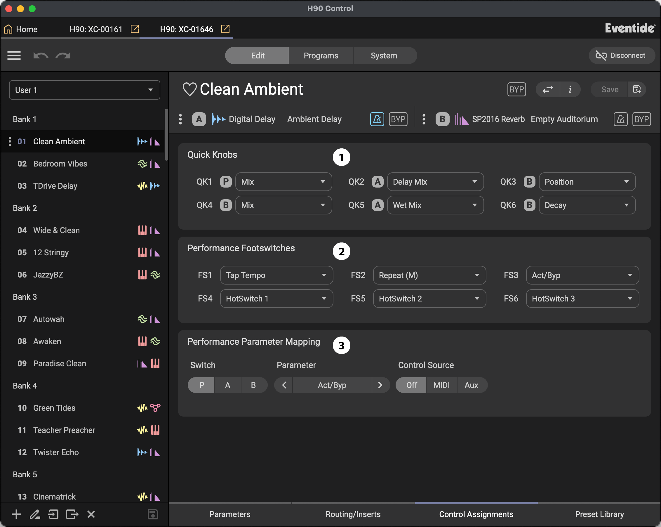 Assign Performance Parameters and HotSwitches to the 6 onboard footswitches.