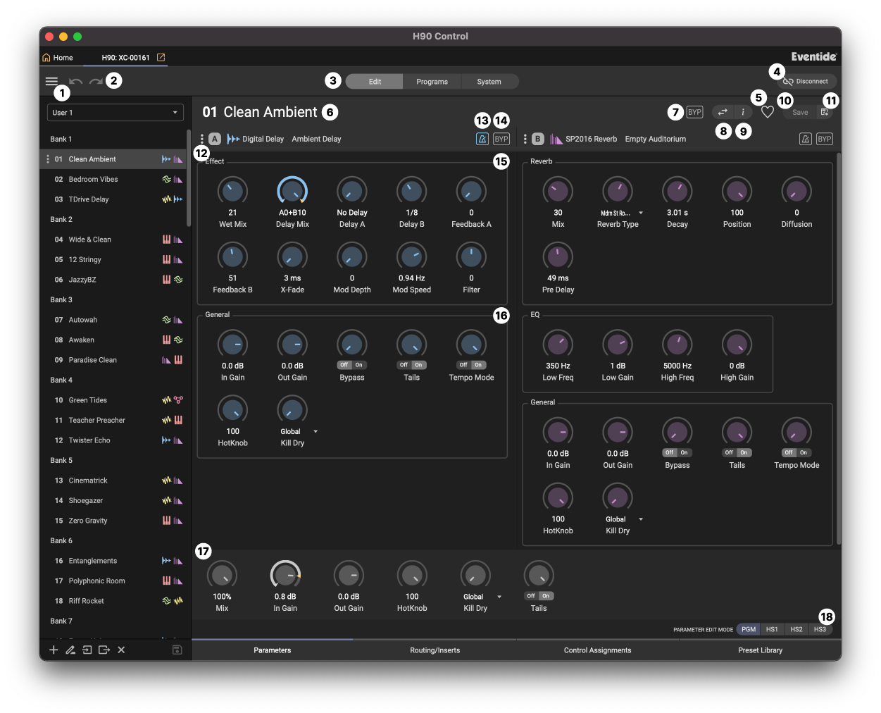 Edit Program general parameters, such as the HotKnob, gain levels, tails, and kill dry settings.