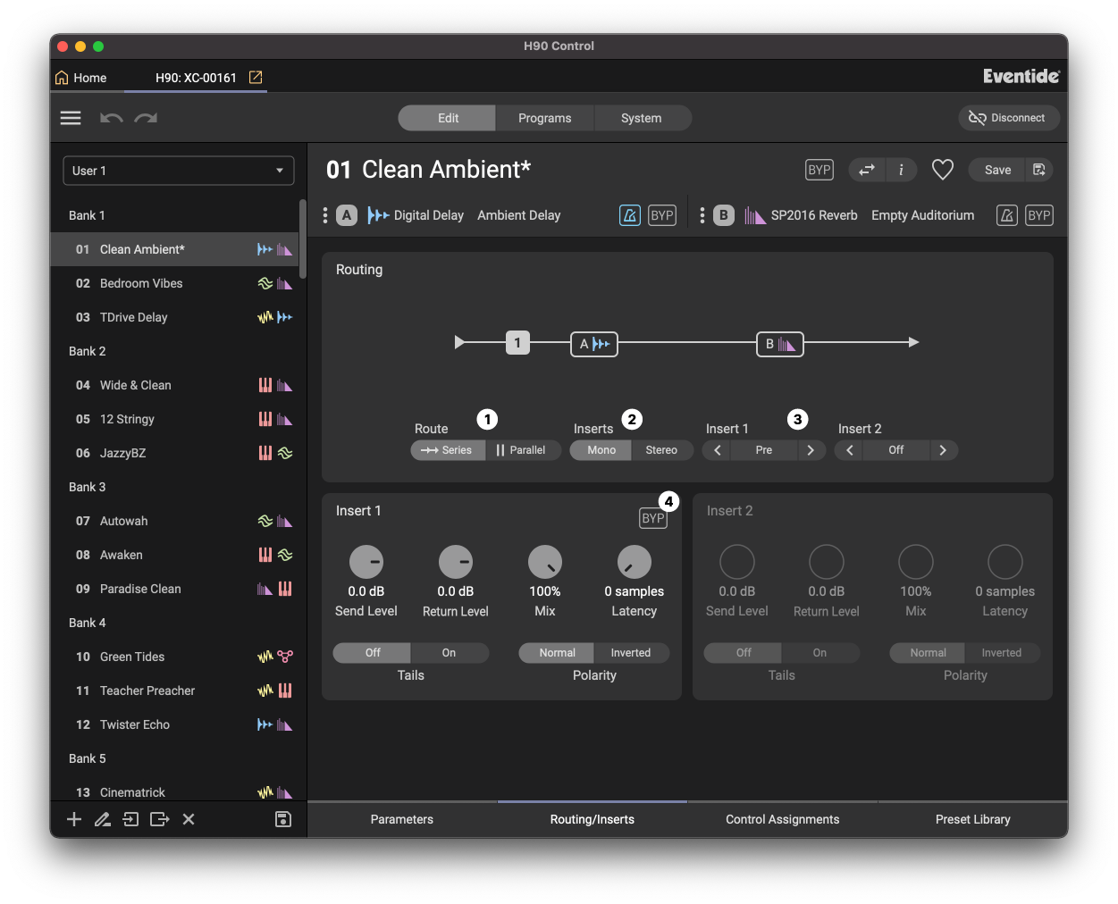 Fig. 10.9 The Routing/Inserts edit menu. Insert 1 is Pre Preset A.¶